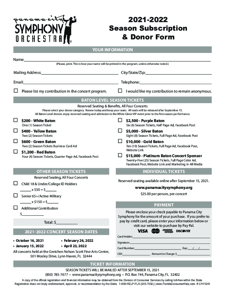 20212022 Season Subscription & Donor Form YOUR INFORMATION Name:(Please, print. This is how your name will be printed in the program, unless otherwise noted.) Mailing Address:City/State/Zip:Email:Telephone:Please