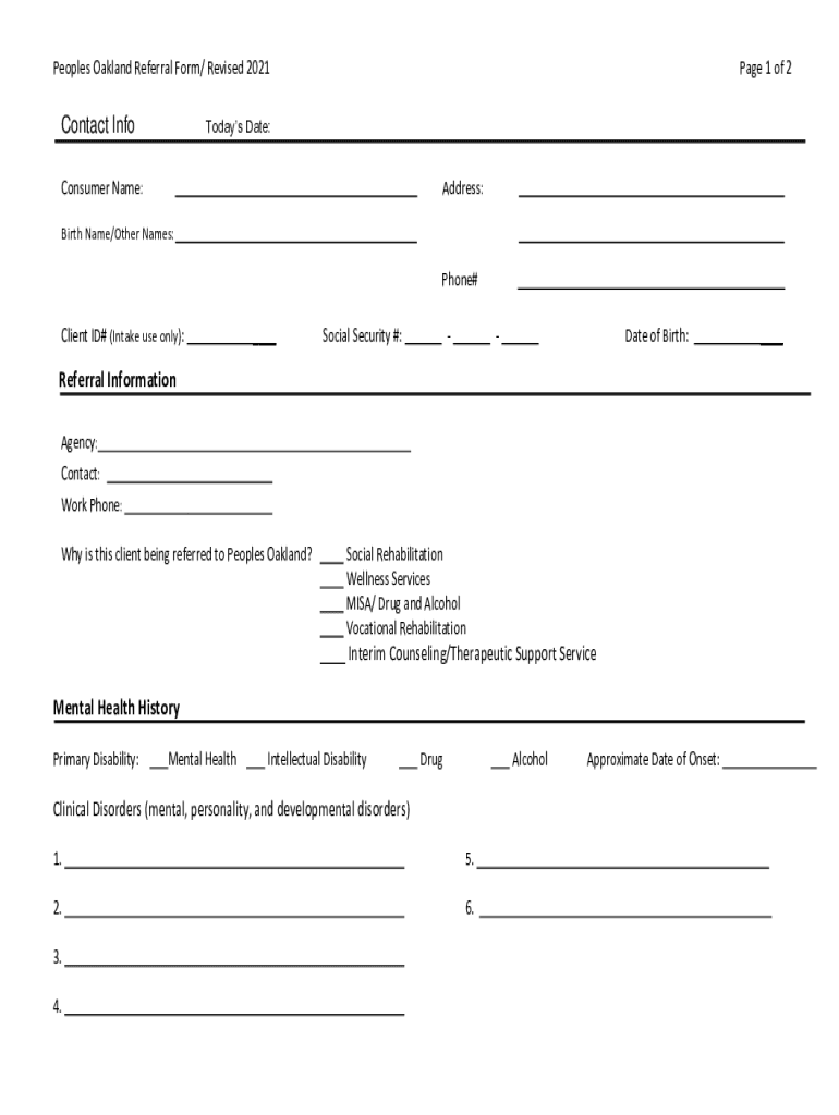 Peoples Oakland Referral Form/ Revised 2021Contact Info Page 1 of 2Todays Date:Consumer Name:Address:Birth Name/Other Names:Phone# Client ID# (Intake use only): Social Security #:Date of Birth:Referral