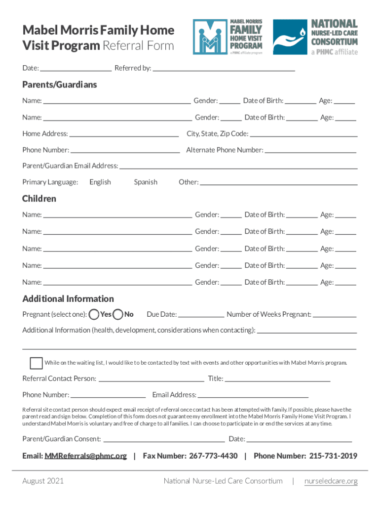 Mabel Morris Family Home Visit Program Referral Form Date:Referred by:Parents/Guardians Name:Gender:Date of Birth:Age:Name:Gender:Date of Birth:Age:Home Address:City, State, Zip Code:Phone Number:Alternate