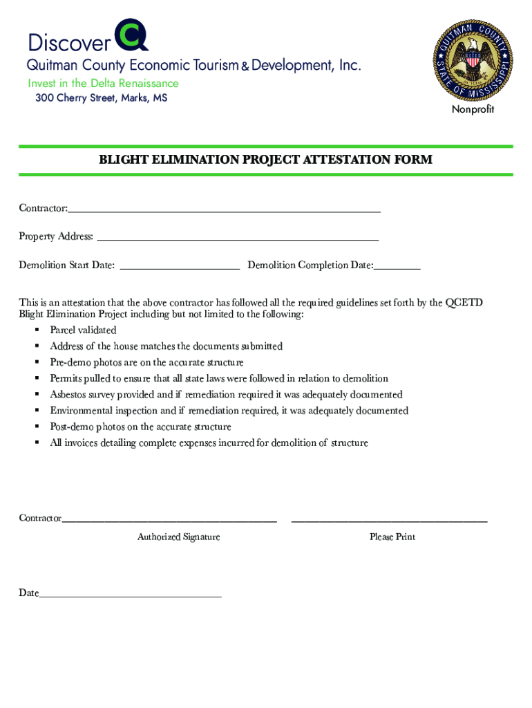 & Invest in the Delta Renaissance 300 Cherry Street, Marks, MSNonprofitBLIGHT ELIMINATION PROJECT ATTESTATION FORMContractor: Property Address: Demolition Start Date: Demolition Completion Date: This