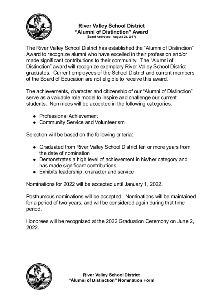 River Valley School District Alumni of Distinction Award (Board Approved: August 28, 2017)The River Valley School District has established the Alumni of Distinction Award to recognize alumni who have