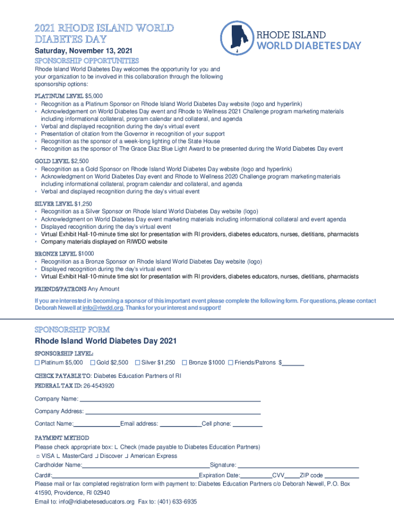 2021 RHODE ISLAND WORLD DIABETES DAY Saturday, November 13, 2021, SPONSORSHIP OPPORTUNITIES Rhode Island World Diabetes Day welcomes the opportunity for you and your organization to be involved in