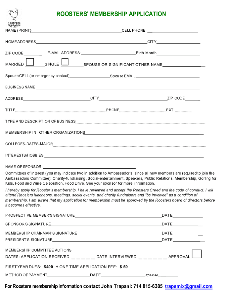 ROOSTERS MEMBERSHIP APPLICATION NAME (PRINCELY PHONE CATHODE ADDRESS ZIP CODE MARRIEDBirth Montreal ADDRESS: SINGLESPOUSE OR SIGNIFICANT OTHER Espouse CELL (or emergency contact Spouse EMAILBUSINESS