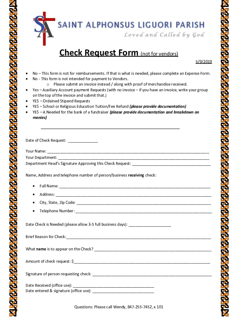 Check Request Form (not for vendors) 5/9/2019 No This form is not for reimbursements. If that is what is needed, please complete an Expense Form. No This form is not intended for payment to Vendors.