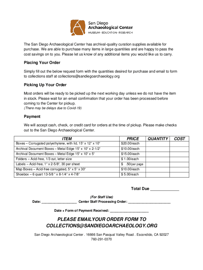 The San Diego Archaeological Center has archival quality curation supplies available for purchase. We are able to purchase many items in large quantities and are happy to pass the cost savings on