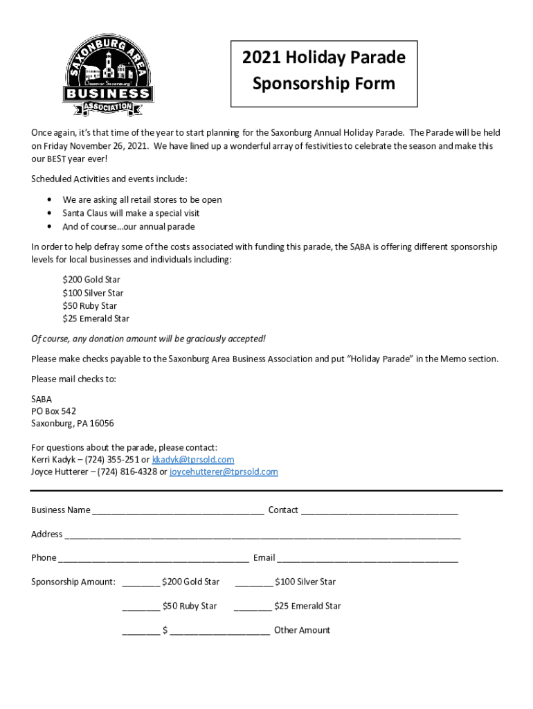 2021 Holiday Parade Sponsorship Form Once again, it's that time of the year to start planning for the Saxon burg Annual Holiday Parade. The Parade will be held on Friday, November 26, 2021. We have