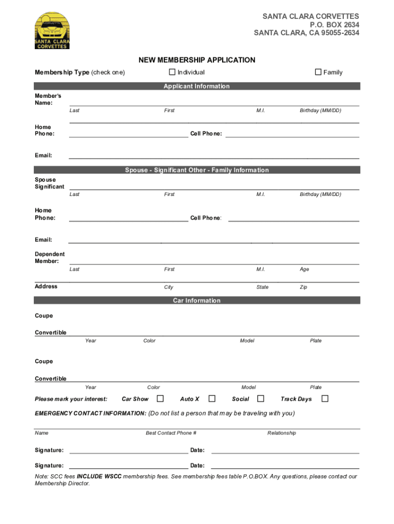 SANTA CLARA CORVETTES P.O. BOX 2634 SANTA CLARA, CA 950552634NEW MEMBERSHIP APPLICATION Membership Type (check one)IndividualFamilyApplicant Information Members Name: LastFirstHome Phone:M.I. Birthday