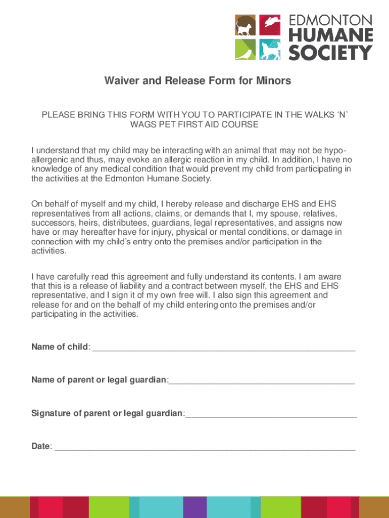 Waiver and Release Form for Minors PLEASE BRING THIS FORM WITH YOU TO PARTICIPATE IN THE WALKS N WAGS PET FIRST AID COURSE understand that my child may be interacting with an animal that may not be