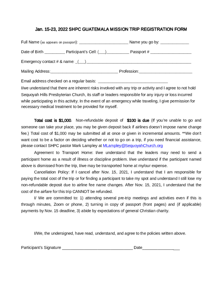 Jan. 1523, 2022 HPC GUATEMALA MISSION TRIP REGISTRATION FORM Full Name (as appears on passport): Name you go by: Date of Birth Participants Cell: () Passport # Emergency contact # & name: () Mailing