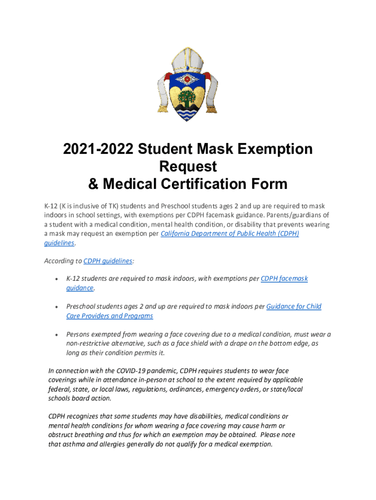 20212022 Student Mask Exemption Request & Medical Certification Form K12 (K is inclusive of TK) students and Preschool students ages 2 and up are required to mask indoors in school settings, with