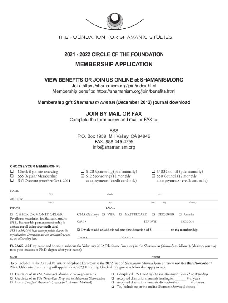 THE FOUNDATION FOR SHAMANIC STUDIES2021 2022 CIRCLE OF THE FOUNDATIONMEMBERSHIP APPLICATION VIEW BENEFITS OR JOIN US ONLINE at SHAMANISM.ORG Join: https://shamanism.org/join/index.html Membership
