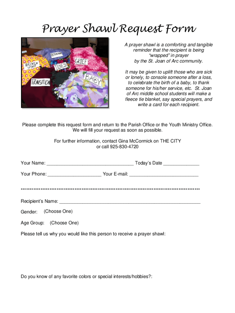 Prayer Shawl Request Form A prayer shawl is a comforting and tangible reminder that the recipient is being wrapped in prayer by the St. Joan of Arc community. It may be given to uplift those who are