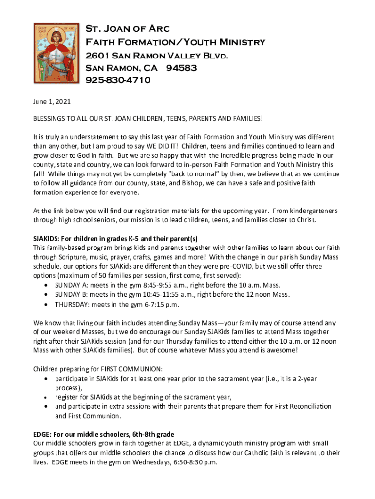 St. Joan of Arc Faith Formation/Youth Ministry 2601 San Ramon Valley Blvd. San Ramon, CA 94583 9258304710 June 1, 2021, BLESSINGS TO ALL OUR ST. JOAN CHILDREN, TEENS, PARENTS AND FAMILIES! It is truly