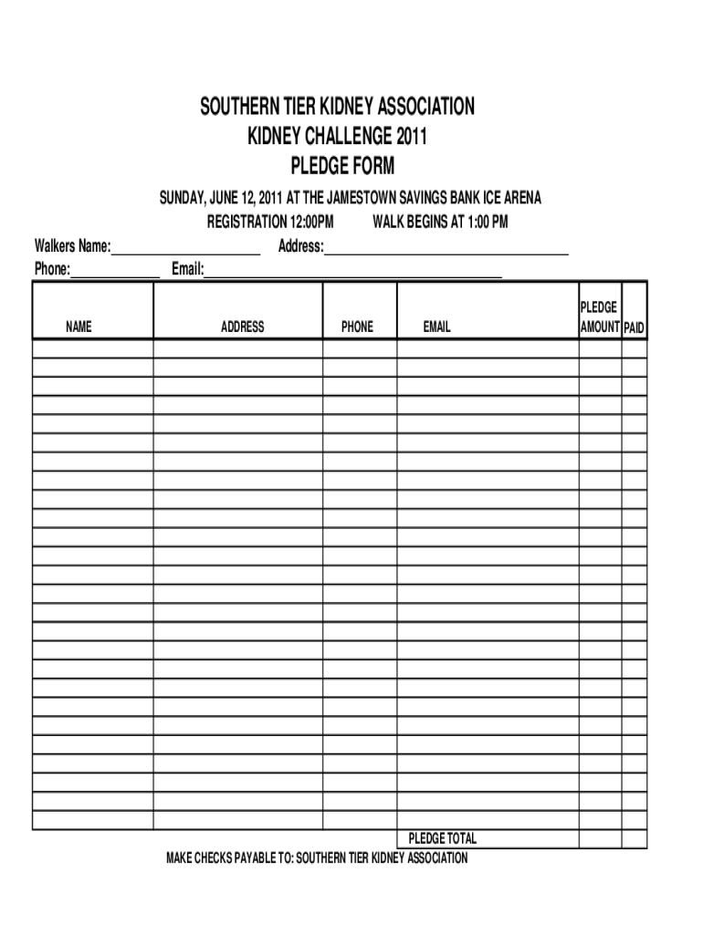SOUTHERN TIER KIDNEY ASSOCIATION KIDNEY CHALLENGE 2011 PLEDGE FORM SUNDAY, JUNE 12, 2011, AT THE JAMESTOWN SAVINGS BANK ICE ARENA REGISTRATION 12:00PM WALK BEGINS AT 1:00 PM Walkers Name: Address: