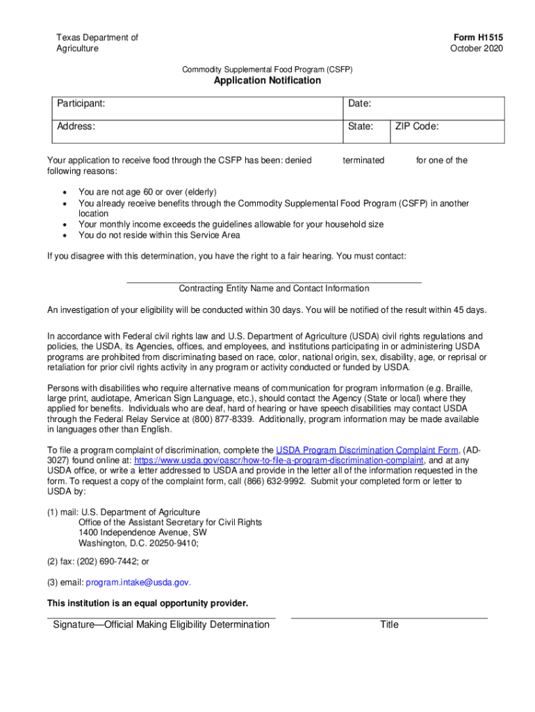 Texas Department of AgricultureForm H1515 October 2020 Commodity Supplemental Food Program (CSF)Application Notification Participant:Date:Address:State:Your application to receive food through the
