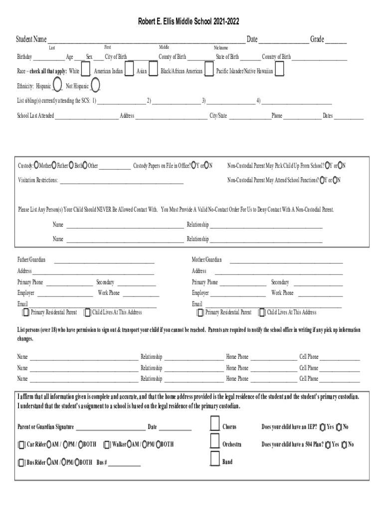 Robert E. Ellis Middle School 20212022Student Name Date Grade FirstLastMiddleNicknameBirthday Age Sex City of Birth County of Birth State of Birth Country of Birth Race check all that apply: White