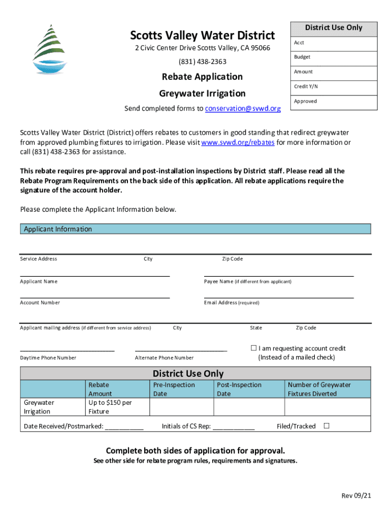 District Use OnlyScotts Valley Water DistrictAcct2 Civic Center Drive Scott's Valley, CA 95066Budget(831) 4382363AmountRebate ApplicationCredit Y/Greater IrrigationApprovedSend completed forms to