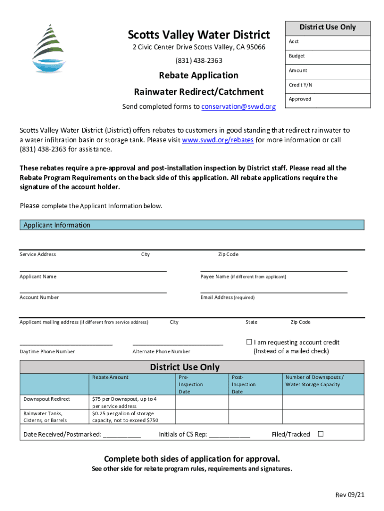 District Use OnlyScotts Valley Water DistrictAcct2 Civic Center Drive Scott's Valley, CA 95066Budget(831) 4382363AmountRebate ApplicationCredit Y/Rainwater Redirect/CatchmentApprovedSend completed