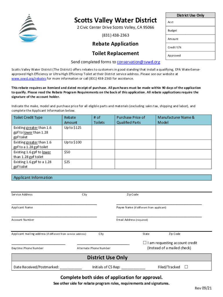 District Use OnlyScotts Valley Water DistrictAcct2 Civic Center Drive Scott's Valley, CA 95066Budget(831) 4382363AmountRebate ApplicationCredit Y/Toilet ReplacementApprovedSend completed forms to