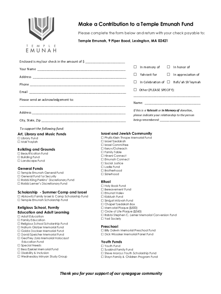 Make a Contribution to a Temple Emu nah Fund Please complete the form below and return with your check payable to: Temple Emu nah, 9 Piper Road, Lexington, MA 02421Enclosed is my/our check in the