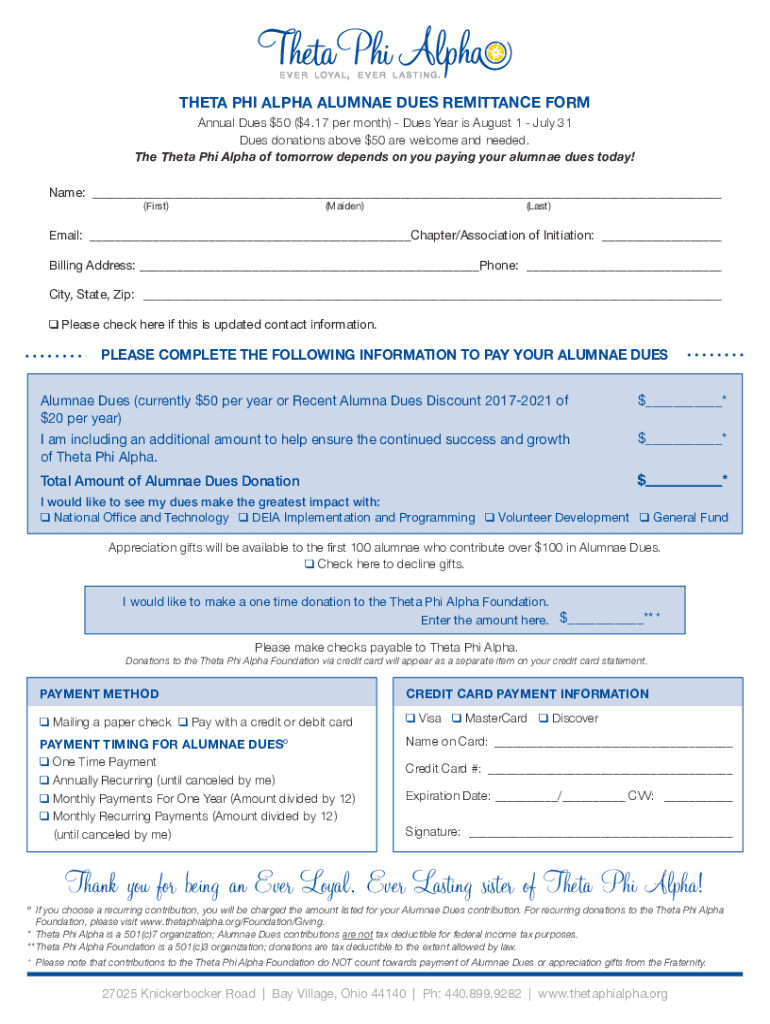 THETA PHI ALPHA ALUMNAE DUES REMITTANCE Nonmanual Dues $50 ($4.17 per month) Dues Year is August 1 July 31 Dues donations above $50 are welcome and needed. The Theta Phi Alpha of tomorrow depends