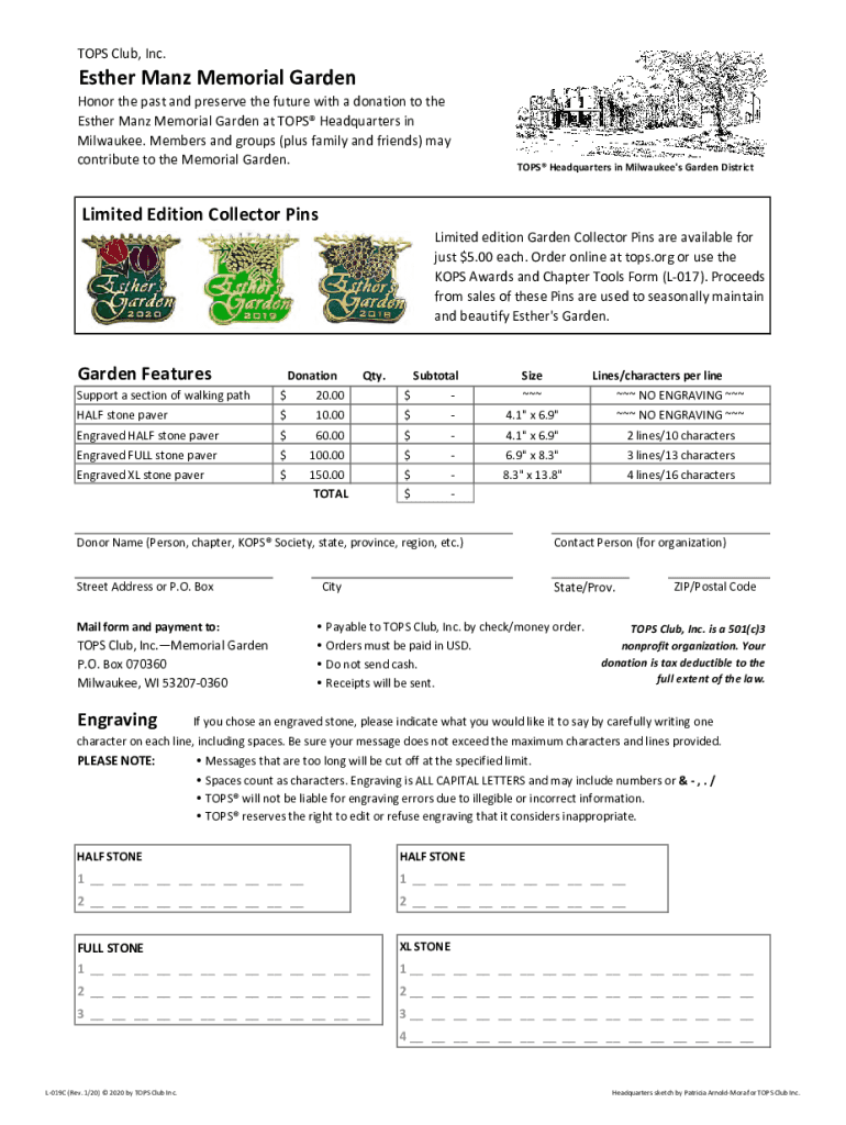 TOPS Club, Inc. Esther Many Memorial GardenHonor the past and preserve the future with a donation to the Esther Many Memorial Garden at TOPS Headquarters in Milwaukee. Members and groups (plus family