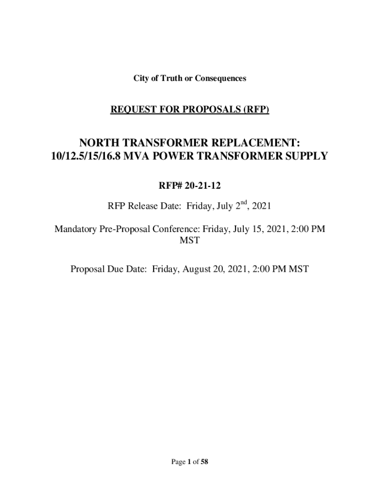 City of Truth or ConsequencesREQUEST FOR PROPOSALS (RFP)NORTH TRANSFORMER REPLACEMENT: 10/12.5/15/16.8 MVA POWER TRANSFORMER SUPPLY RFP# 202112 RFP Release Date: Friday, July 2nd, 2021 Mandatory Proposal