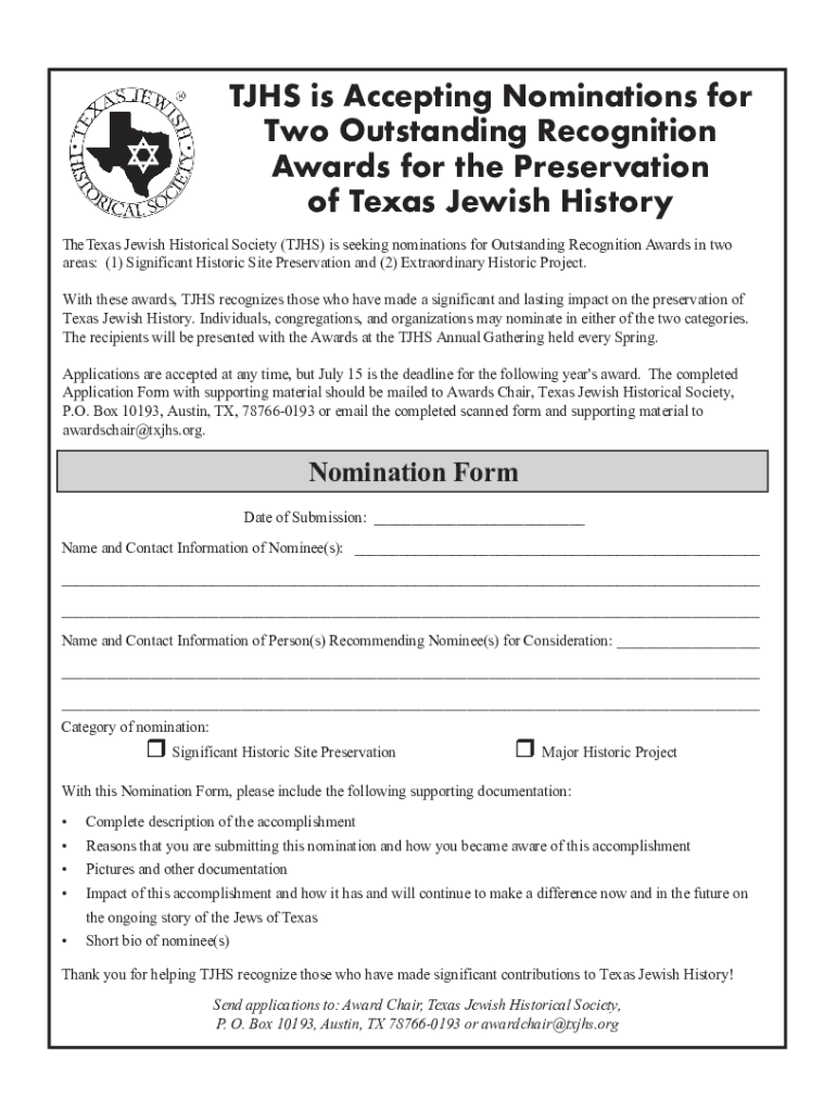 JHS is Accepting Nominations for Two Outstanding Recognition Awards for the Preservation of Texas Jewish History The Texas Jewish Historical Society (JHS) is seeking nominations for Outstanding Recognition