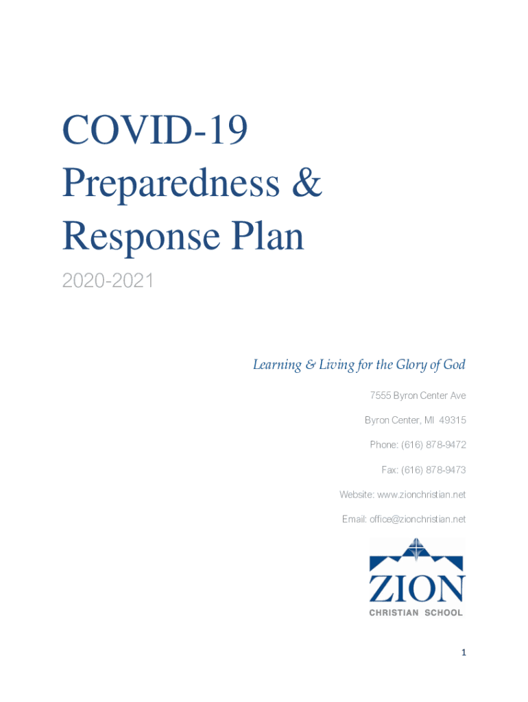 COVID-19 Preparedness & Response Plan 20202021Learning & Living for the Glory of God 7555 Byron Center Ave Byron Center, MI 49315 Phone: (616) 8789472 Fax: (616) 8789473 Website: www.zionchristian.net