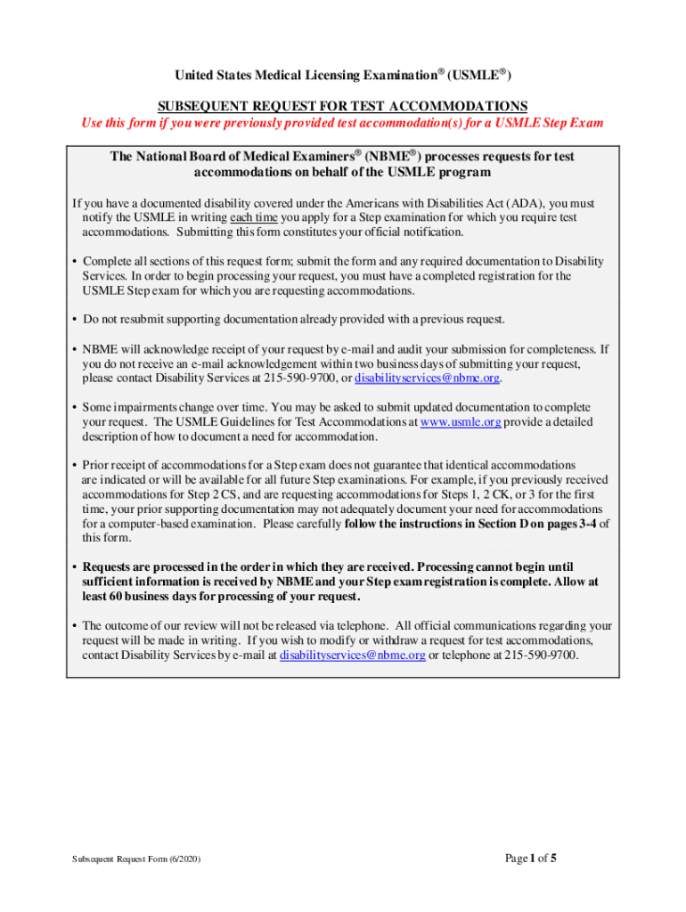 United States Medical Licensing Examination (USMLE) SUBSEQUENT REQUEST FOR TEST ACCOMMODATIONS Use this form if you were previously provided test accommodation(s) for a USMLE Step Exam The National