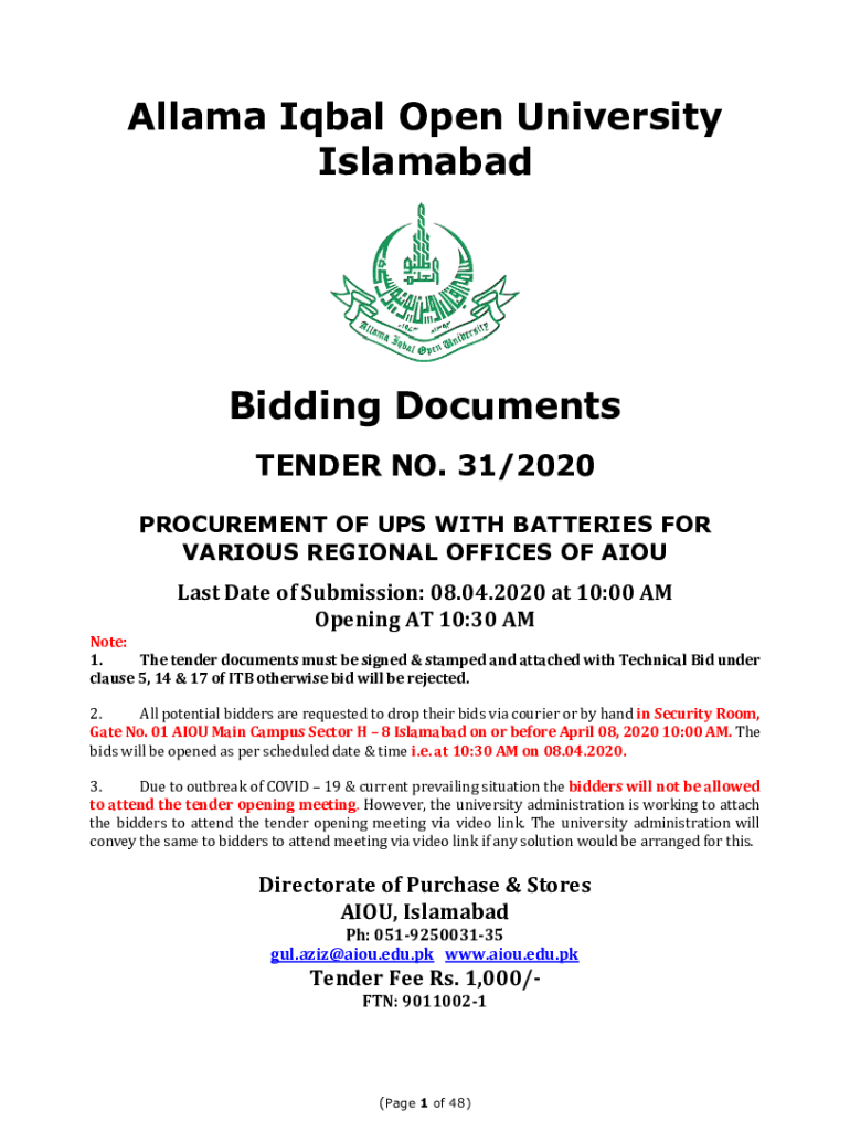 Llama Iqbal Open University IslamabadBidding Documents TENDER NO. 31/2020 PROCUREMENT OF UPS WITH BATTERIES FOR VARIOUS REGIONAL OFFICES OF AINU Last Date of Submission: 08.04.2020 at 10:00 AM Opening