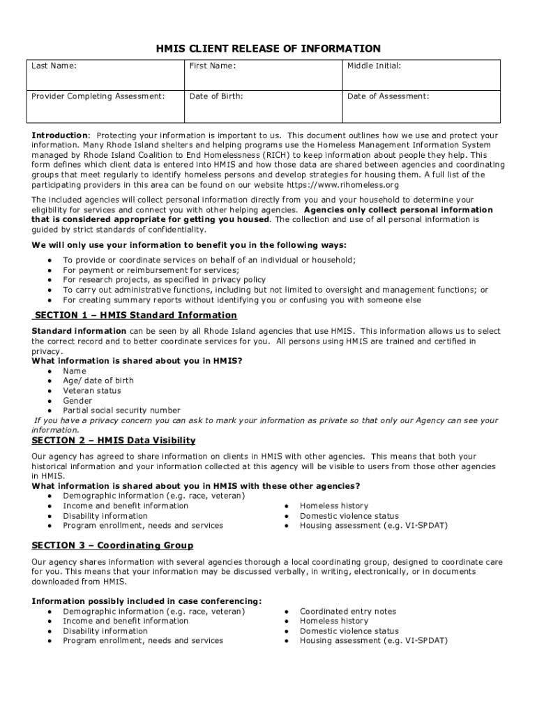 HIS CLIENT RELEASE OF INFORMATION Last Name:First Name:Middle Initial:Provider Completing Assessment:Date of Birth:Date of Assessment:Introduction: Protecting your information is important to us.