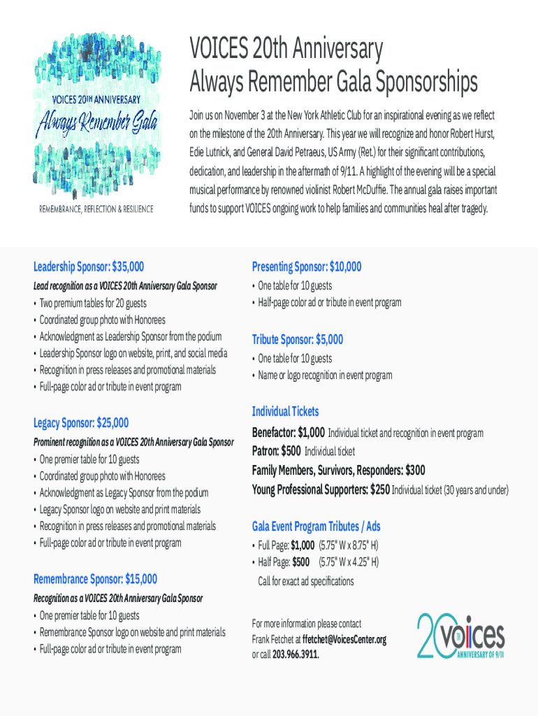 VOICES 20th Anniversary Always Remember Gala Sponsorships Join us on November 3 at the New York Athletic Club for an inspirational evening as we reflect on the milestone of the 20th Anniversary. This