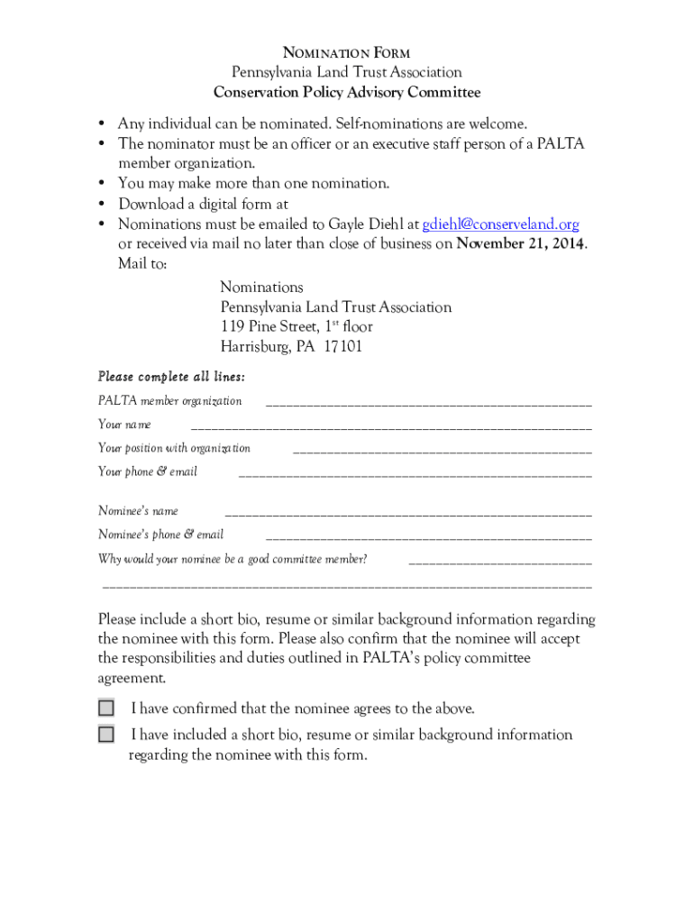 NOMINATION FORM Pennsylvania Land Trust Association Conservation Policy Advisory Committee Any individual can be nominated. Self nominations are welcome. The nominator must be an officer or an executive