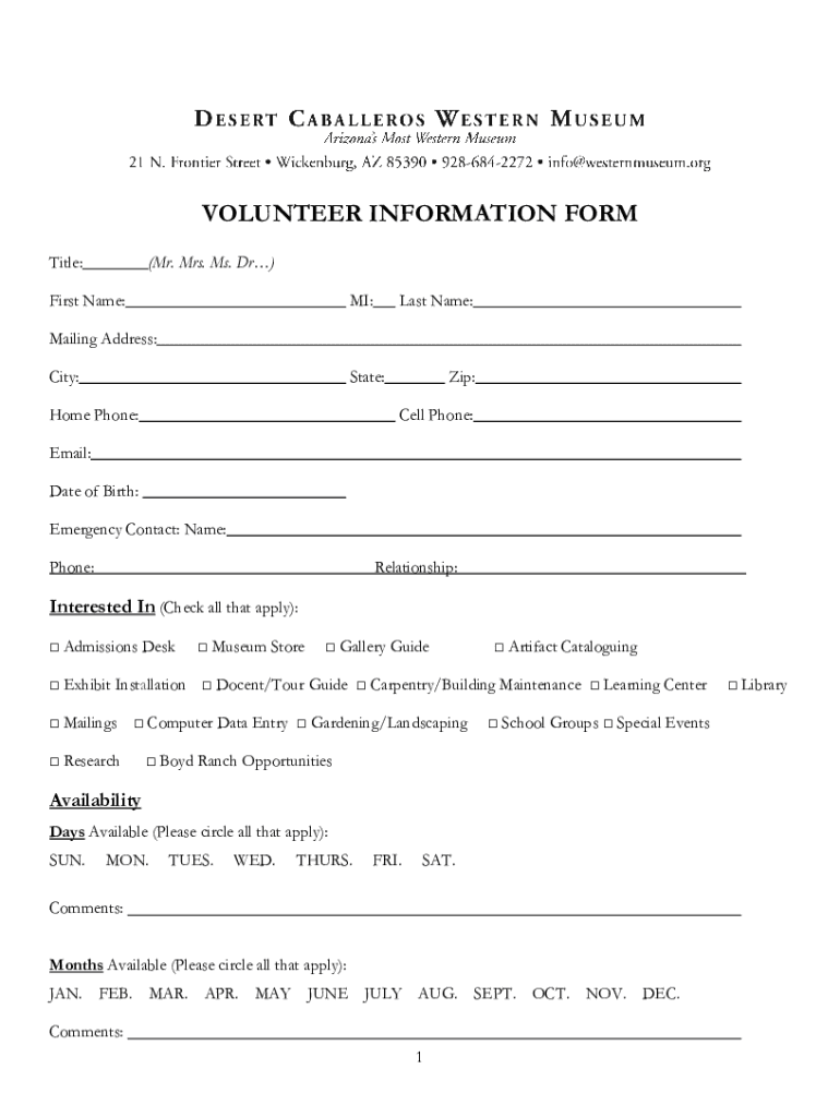 VOLUNTEER INFORMATION FORM Title:(Mr. Mrs. Ms. Dr)First Name:MI:Last Name:Mailing Address: City:State:Home Phone:Zip: Cell Phone:Email: Date of Birth: Emergency Contact: Name: Phone: Relationship: