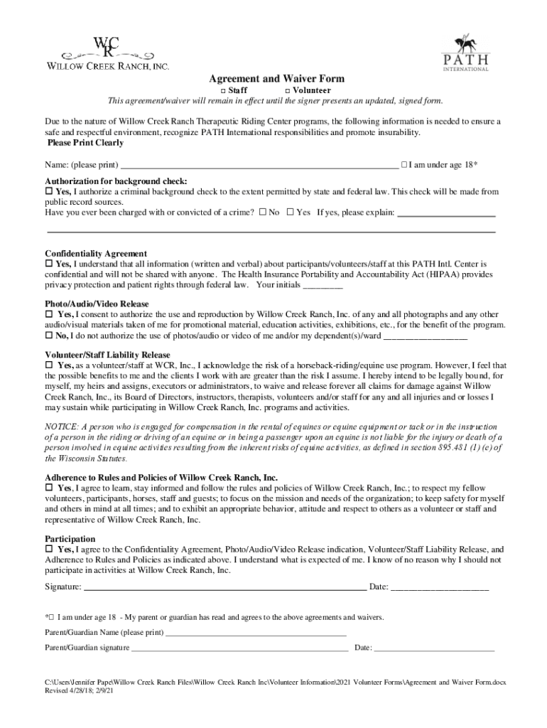 Agreement and Waiver Form Staff Volunteer This agreement/waiver will remain in effect until the signer presents an updated, signed form. Due to the nature of Willow Creek Ranch Therapeutic Riding