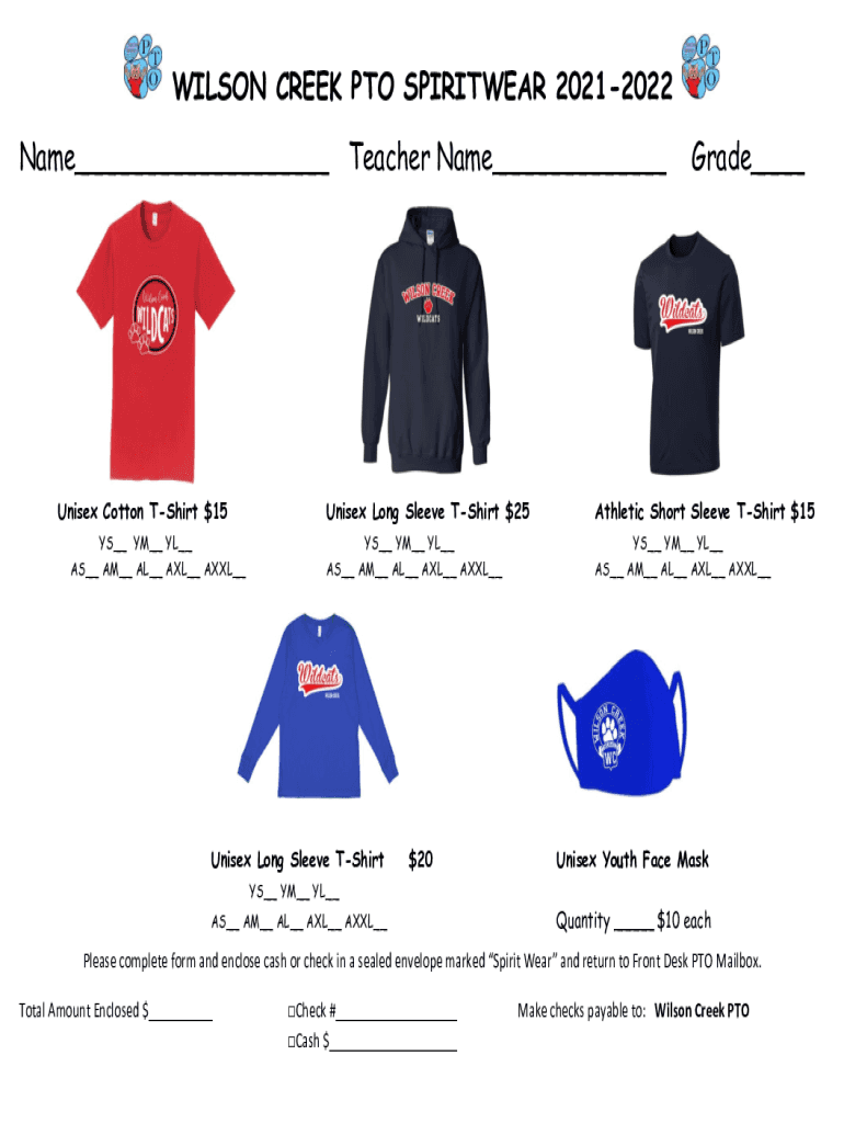 WILSON CREEK PTO SPIRITUAL 20212022 Name Teacher Name Unisex Cotton Shirt $15 IS YM YL AS AM AL AXL Grade Unisex Long Sleeve Shirt $25Athletic Short Sleeve Shirt $15YS YM YL AS AM AL AXL IS YM YL