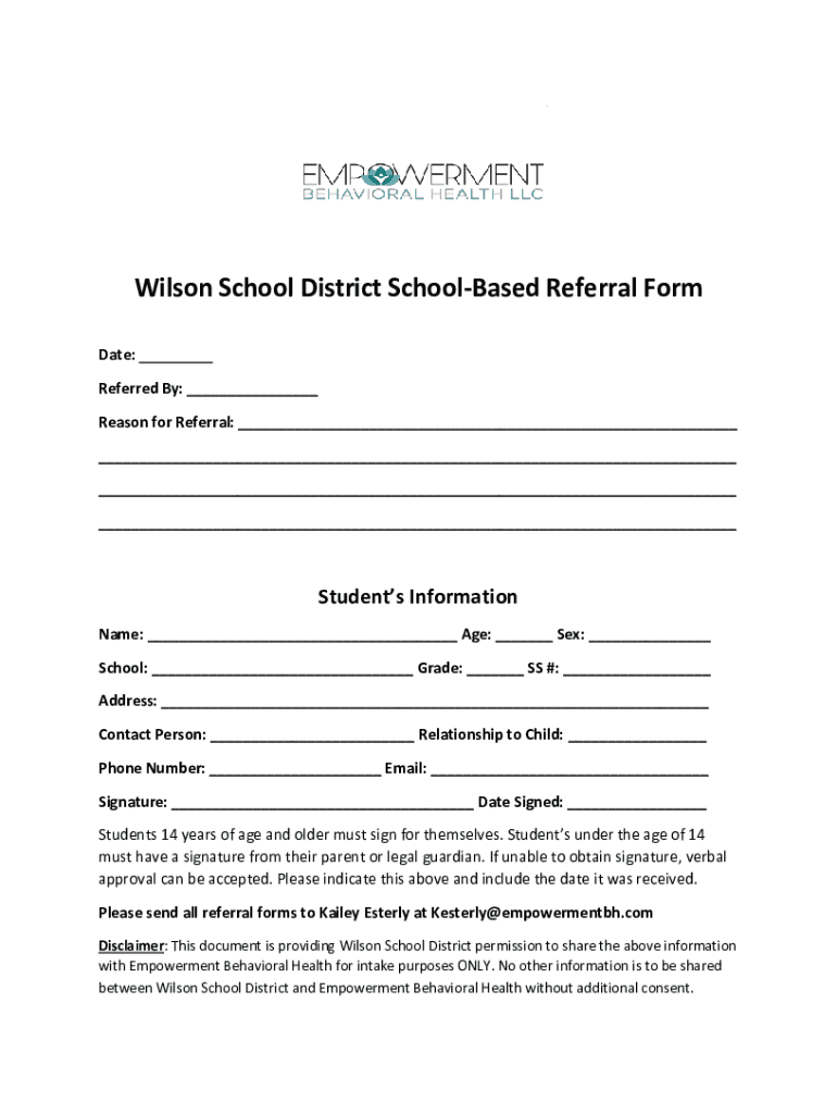 Wilson School District Schooled Referral Form Date: Referred By: Reason for Referral: Students Information Name: Age: Sex: School: Grade: SS #: Address: Contact Person: Relationship to Child: Phone