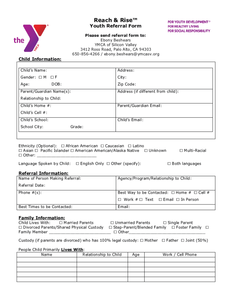 Reach & RiseYouth Referral Form Please send referral form to: Ebony Besmears YMCA of Silicon Valley 3412 Ross Road, Palo Alto, CA 94303 6508564266 / ebony.beshears@ymcasv.orgChild Information: Child's
