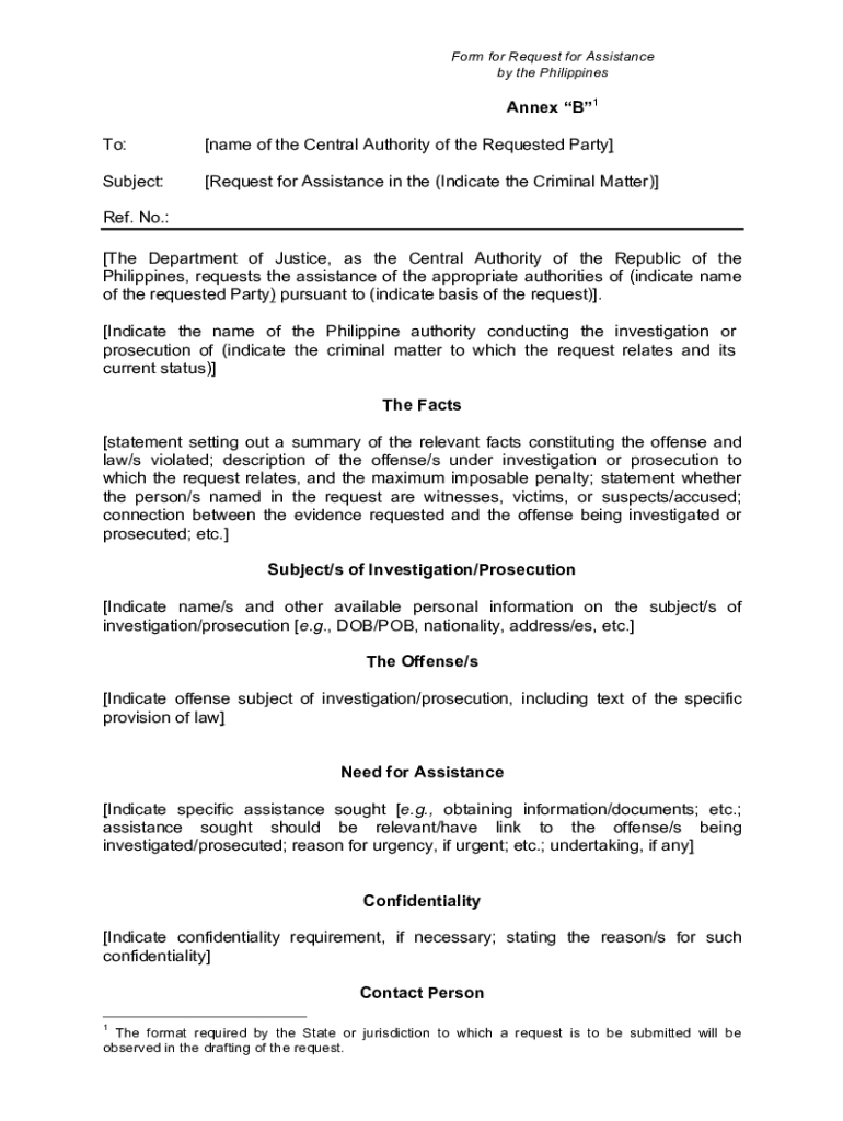Form for Request for Assistance by the PhilippinesAnnex B1 To: name of the Central Authority of the Requested Party Subject: Request for Assistance in the (Indicate the Criminal Matter) Ref. No.: