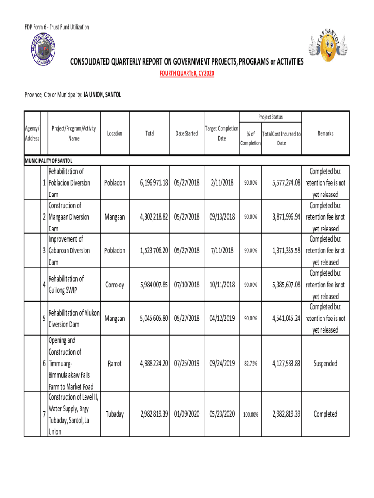 FDP Form 6 Trust Fund UtilizationCONSOLIDATED QUARTERLY REPORT ON GOVERNMENT PROJECTS, PROGRAMS or ACTIVITIES FOURTH QUARTER, CY 2020 Province, City or Municipality: LA UNION, SANTOS Project Status
