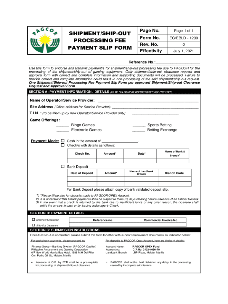 SHIPMENT/SHOUT PROCESSING FEE PAYMENT SLIP FORM Page No. Page 1 of 1Form No.EG/EBLD 1230Rev. No. Effectivity0 July 1, 2021Reference No.: Use this form to endorse and transmit payment/s for shipment/ship