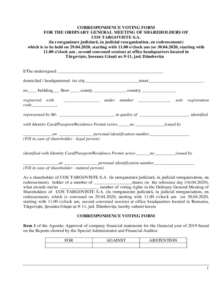 CORRESPONDENCE VOTING FORM FOR THE ORDINARY GENERAL MEETING OF SHAREHOLDERS OF COS TARGOVISTE S.A. (n reorganizer judicial, in judicial reorganization, en refreshment) which is to be held on 29.04.2020,