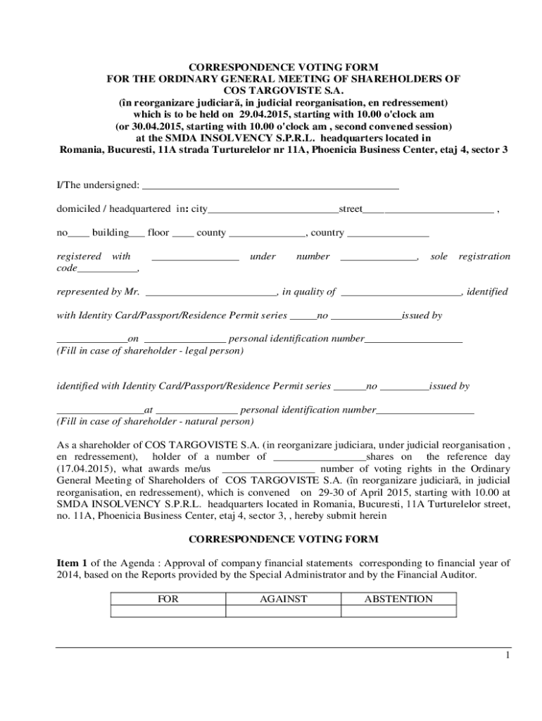 CORRESPONDENCE VOTING FORM FOR THE ORDINARY GENERAL MEETING OF SHAREHOLDERS OF COS TARGOVISTE S.A. (n reorganizer judicial, in judicial reorganization, en refreshment) which is to be held on 29.04.2015,