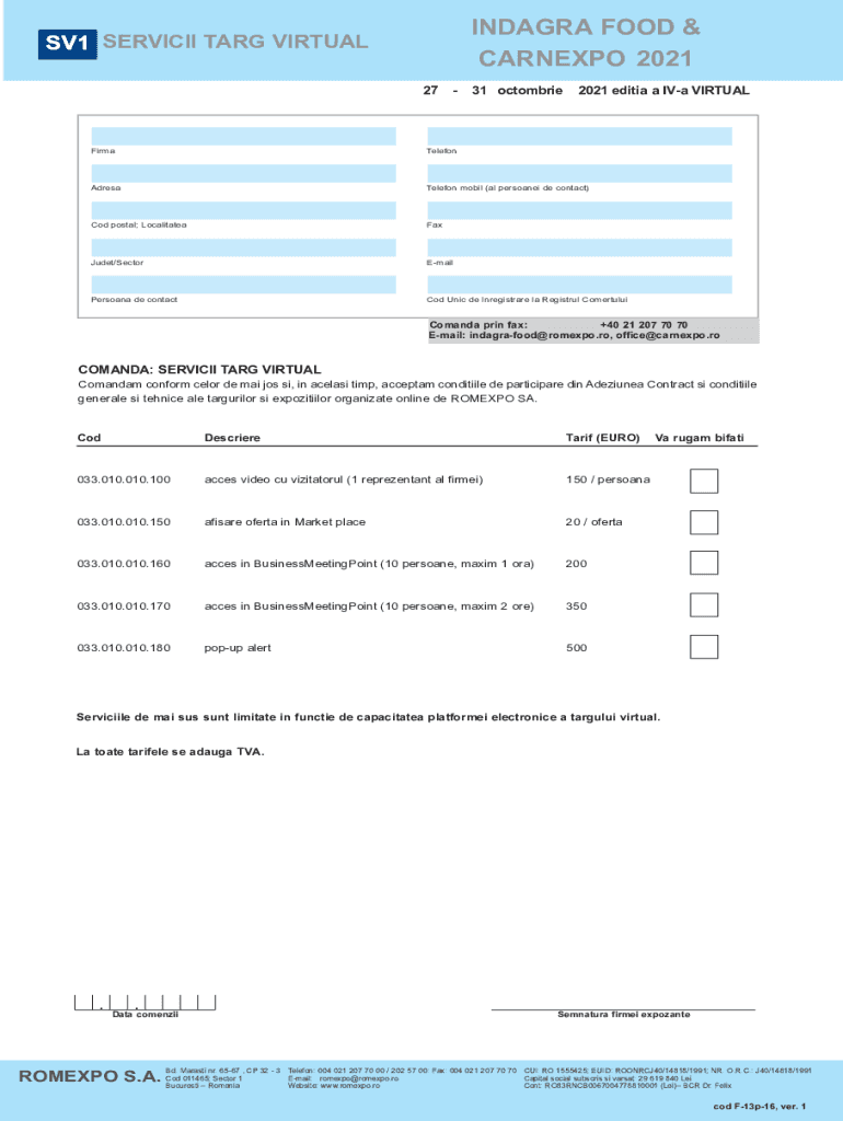 INDIRA FOOD & CARNEGIE 2021SV1 SERVICE TAG VIRTUAL 2731 octombrie2021 edition an Iva VIRTUALFirma CompanyTelefonAdresa AddressTelefon Mobil (all personnel DE contact)Cod postal; Localities Zip codeFaxJudet/SectorEmailPersoana