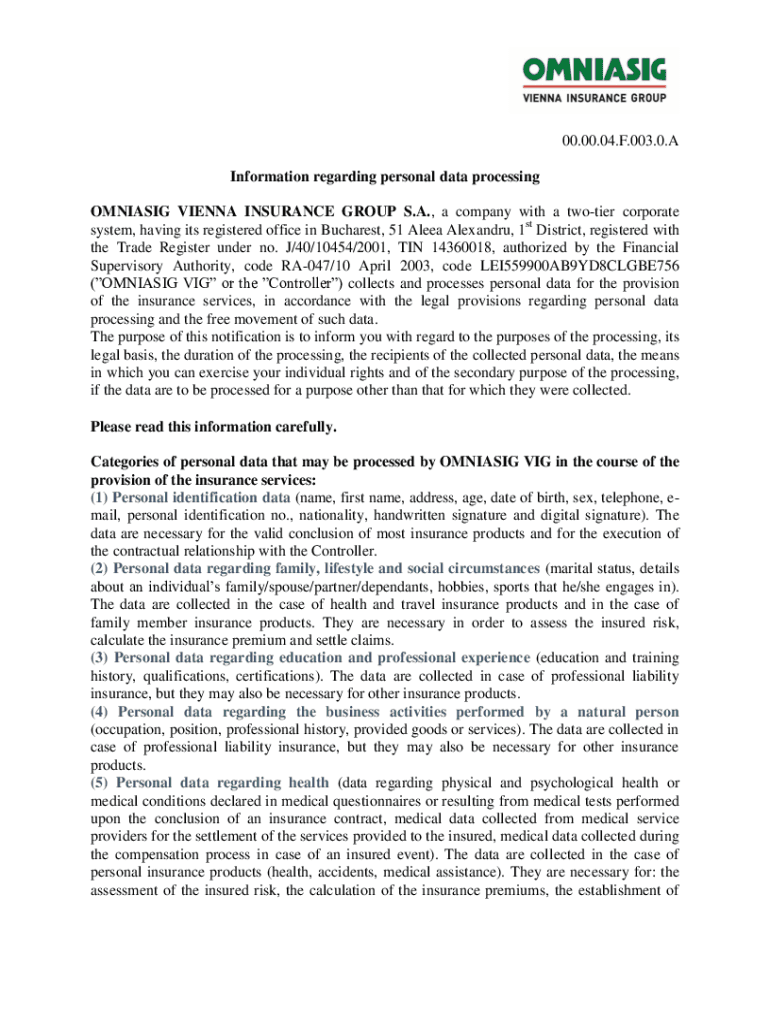 00.00.04. F.003.0. An Information regarding personal data processing OMNIASIG VIENNA INSURANCE GROUP S.A., a company with a two tier corporate system, having its registered office in Bucharest, 51