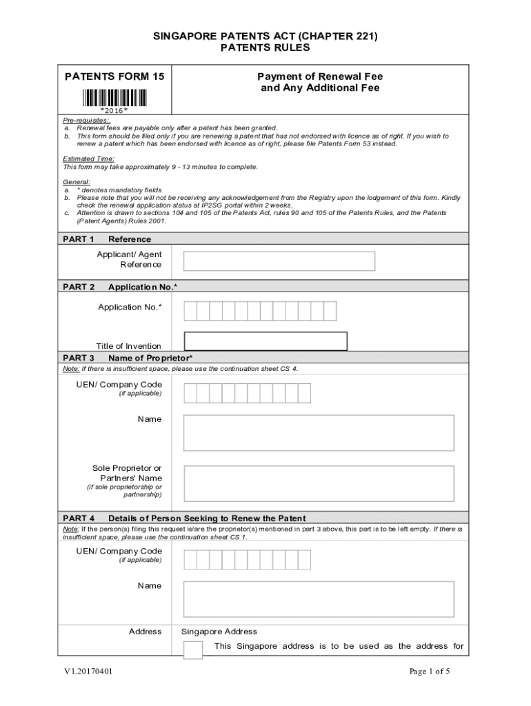 SINGAPORE PATENTS ACT (CHAPTER 221) PATENTS RULES PATENTS FORM 15Payment of Renewal Fee and Any Additional Prerequisites:. a. Renewal fees are payable only after a patent has been granted. b. This