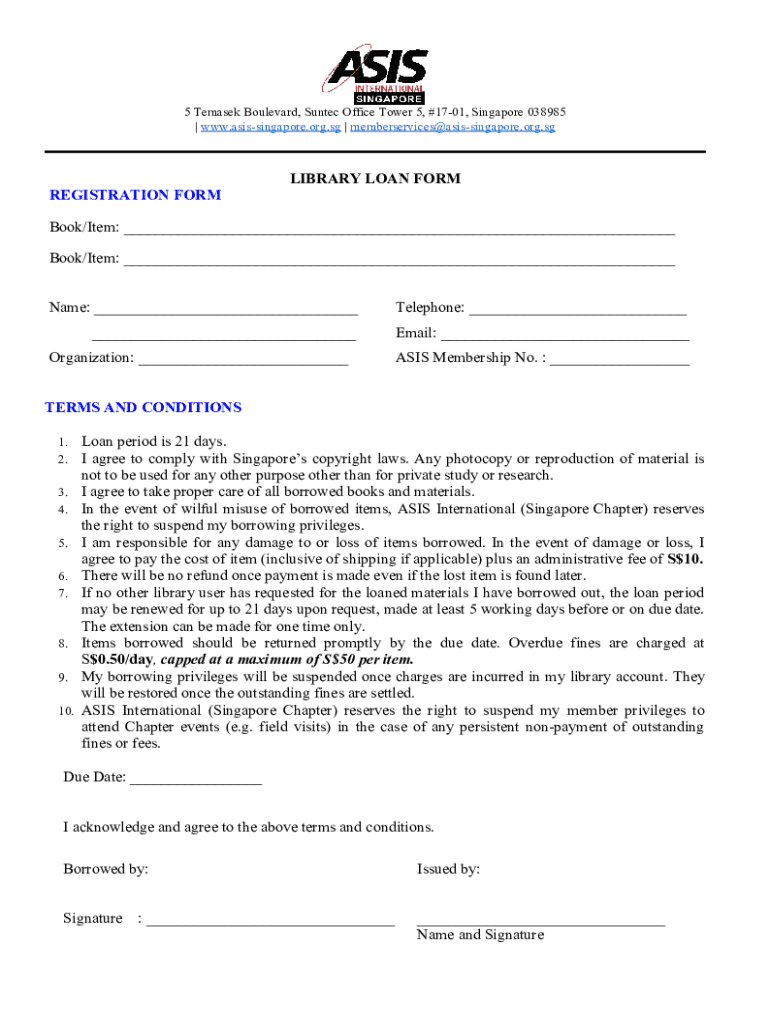 5 Temasek Boulevard, Hunter Office Tower 5, #1701, Singapore 038985 www.asissingapore.org.sg member services asissingapore.org.library LOAN FORM REGISTRATION FORM Book/Item: Book/Item: Name: Telephone: