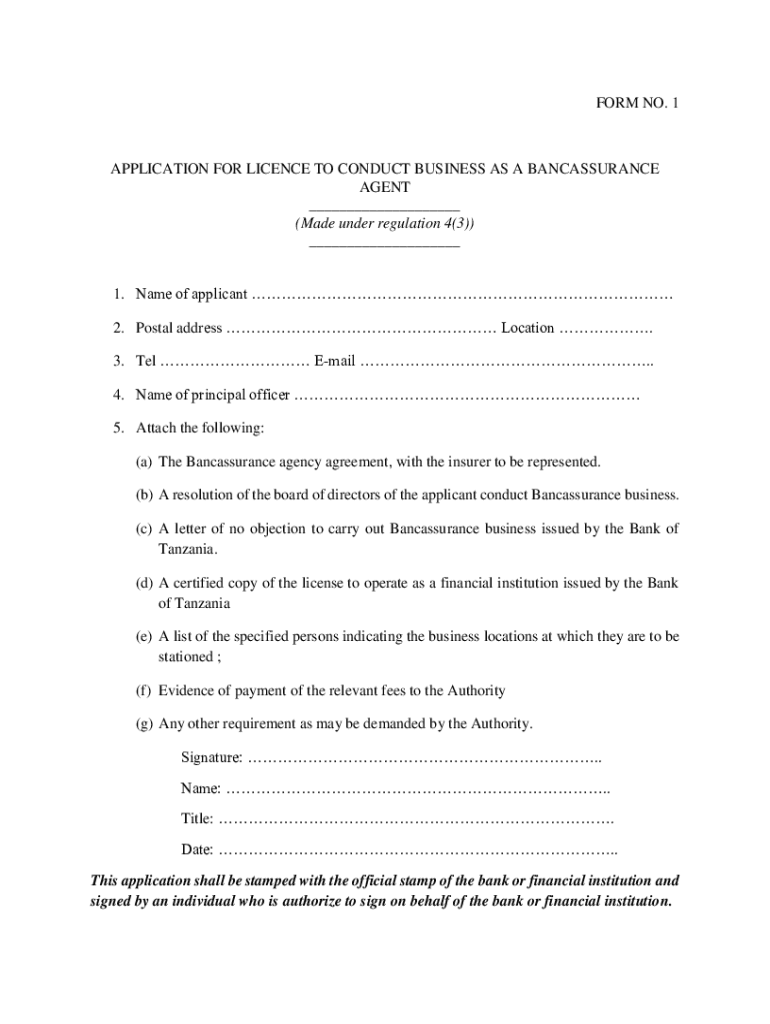FORM NO. 1APPLICATION FOR License TO CONDUCT BUSINESS AS A BANCASSURANCE AGENT (Made under regulation 4(3)) 1. Name of applicant 2. Postal address Location. 3. Tel Email. 4. Name of principal officer