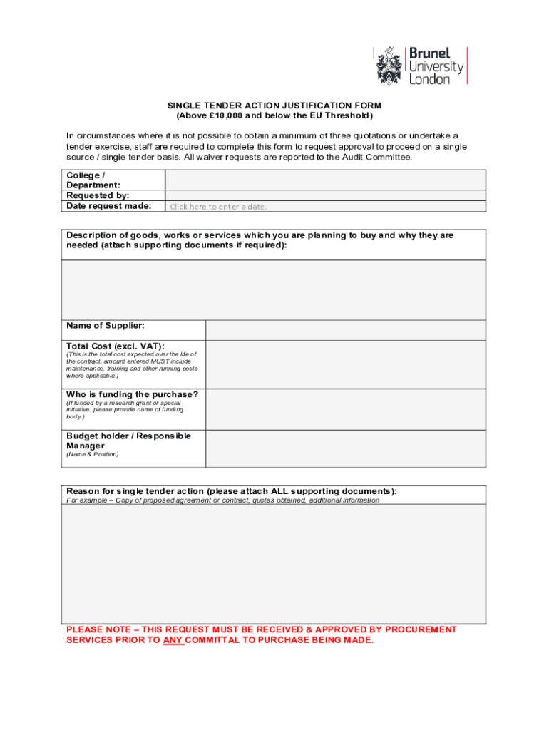 SINGLE TENDER ACTION JUSTIFICATION FORM (Above 10,000 and below the EU Threshold) In circumstances where it is not possible to obtain a minimum of three quotations or undertake a tender exercise,